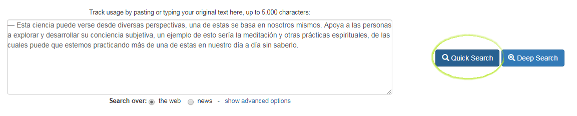 Pegarán el texto y le darán a Quick Search que es búsqueda rápida, buscará en la web, páginas, artículos y demás hasta encontrar alguna coincidencia.