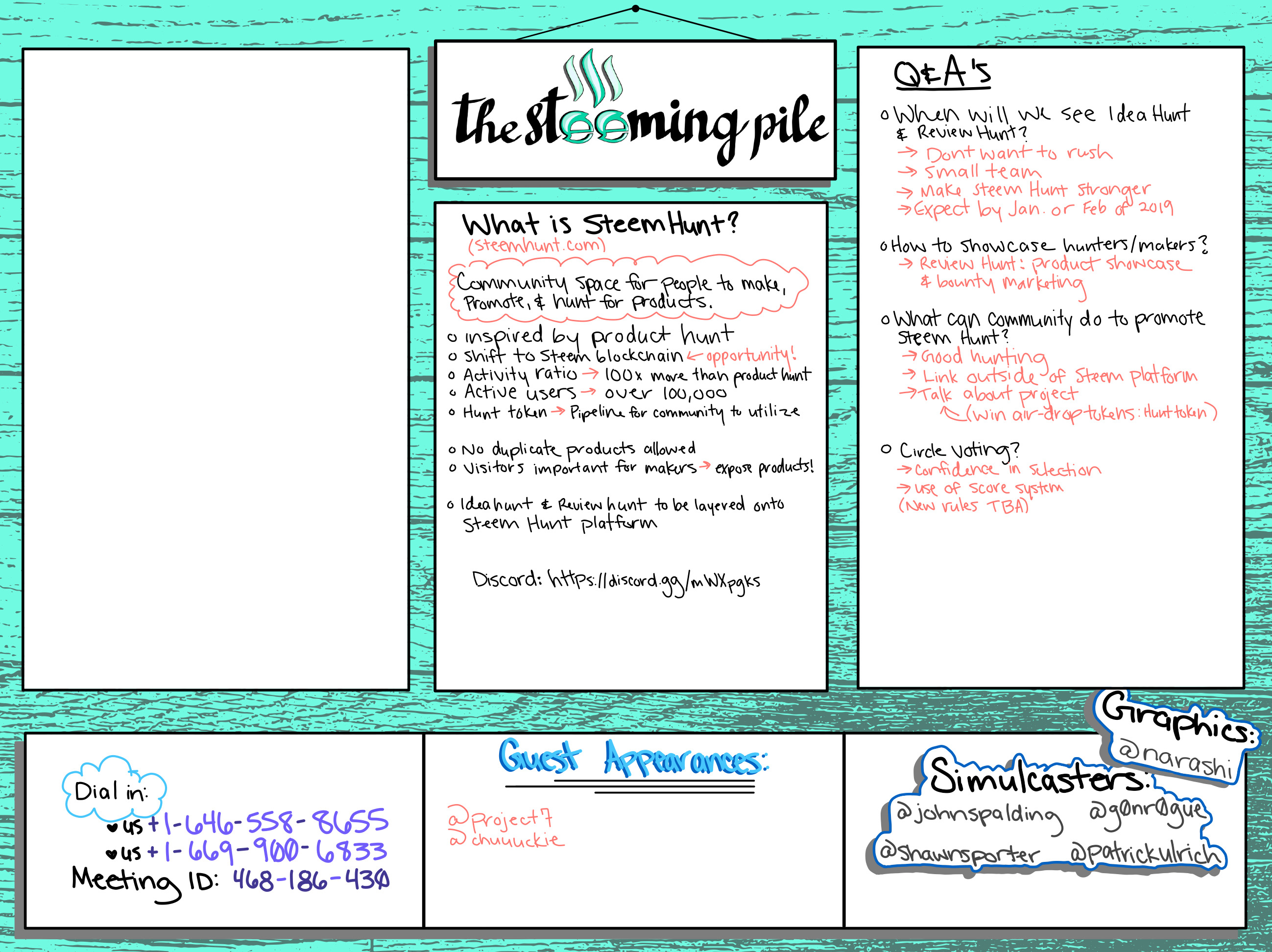 The second graphic, although not completely filled out, has some solid information from the stream that took place on Saturday, October 27. Our guests were @project7 and @chuuuckie from SteemHunt and we had a discussion about the idea of SteemHunt, where it came from, what additions are coming soon, and went over some Q&A's!