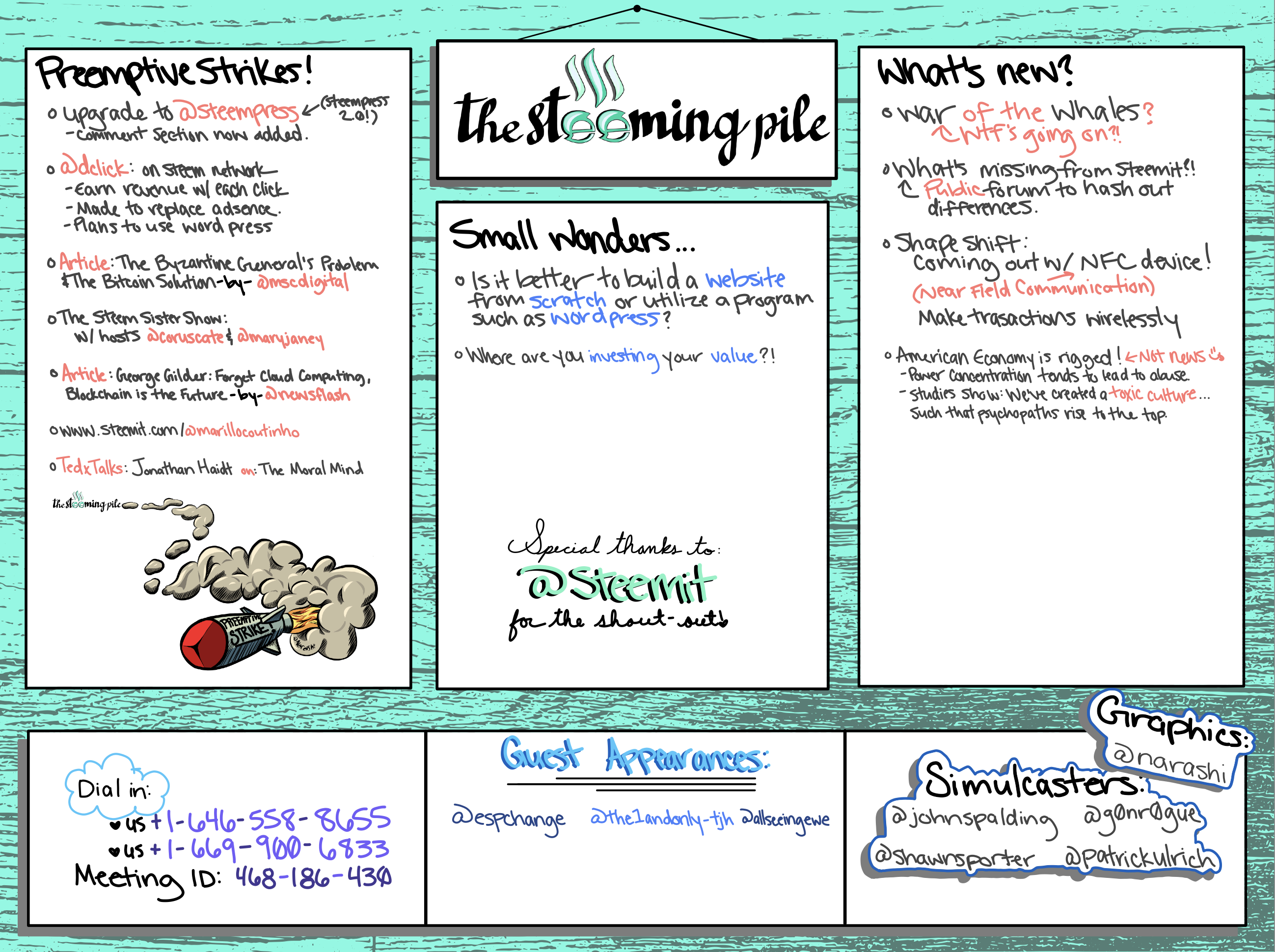 We just had another beautifully interesting episode of @thesteemingpile tonight! As usual, we discussed an array of topics as the conversation bounced around the virtual room. You will see, highlighted in the graphic, the notes that were taken during the discussion 📝.