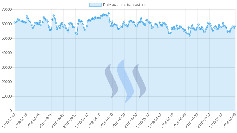 A 'transacting account' is a Steem account that made at least one transaction on the Steem blockchain. This can be a vote, post, comment, transfer, power up or sbd conversion. Users who only read from the Steem blockchain without interacting are not included. The actual number of 'Active users' is therefore much higher than the accounts transacting.