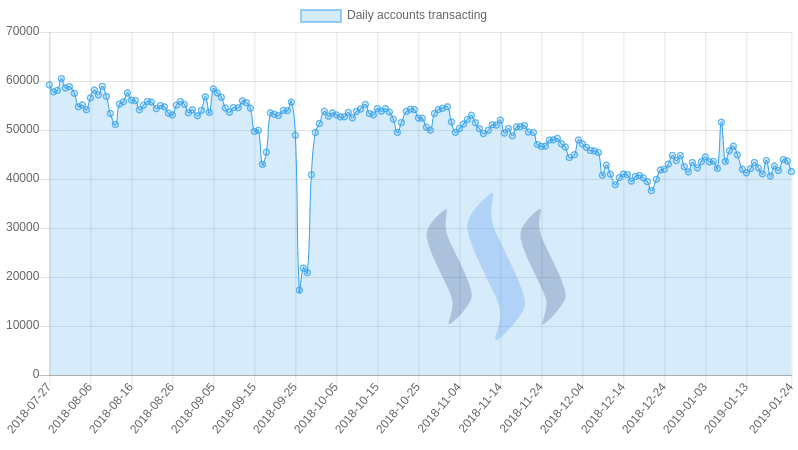 A 'transacting account' is a Steem account that made at least one transaction on the Steem blockchain. This can be a vote, post, comment, transfer, power up or sbd conversion. Users who only read from the Steem blockchain without interacting are not included. The actual number of 'Active users' is therefore much higher than the accounts transacting.