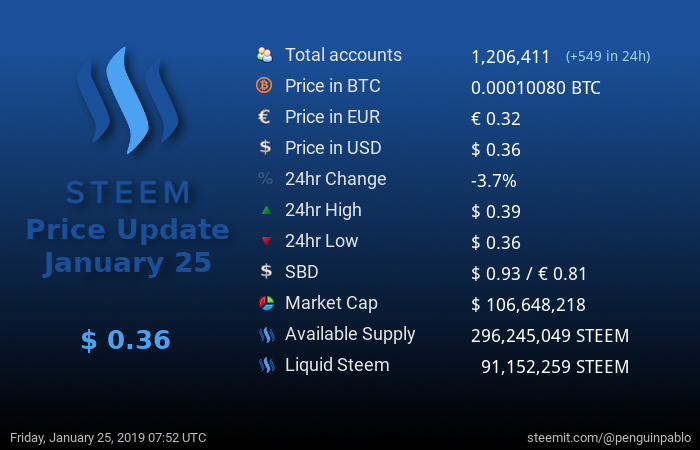 Welcome to my Steem Stats Report for Friday, January 25, 2019. All data comes directly from the Steem blockchain and is based on UTC time.