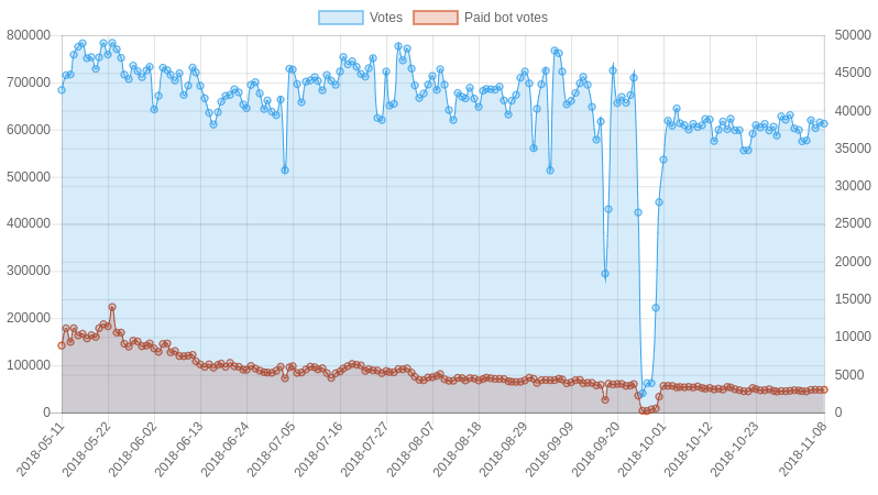 | Date | Votes | Paid bot votes | Percent bot votes |