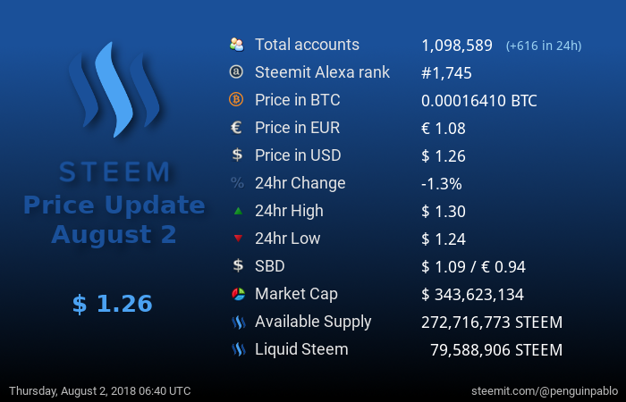 Welcome to my Steem Stats Report for Thursday, August 2, 2018. All data comes directly from the Steem blockchain and is based on UTC time.