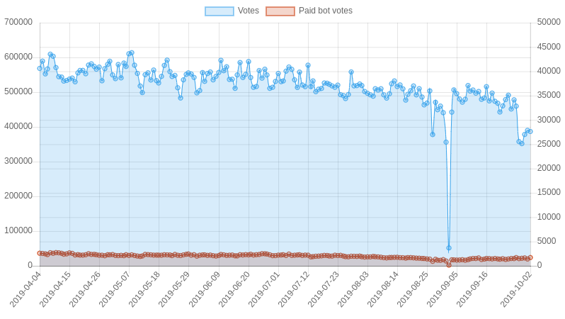 | Date | Votes | Paid bot votes | Percent bot votes |