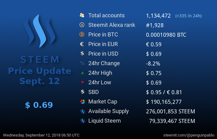 Welcome to my Steem Stats Report for Wednesday, September 12, 2018. All data comes directly from the Steem blockchain and is based on UTC time.