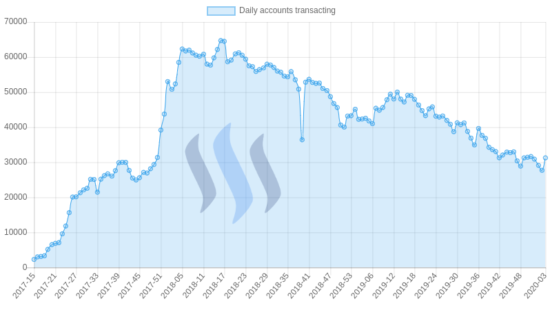 A 'transacting account' is a Steem account that made at least one transaction on the Steem blockchain. This can be a vote, post, comment, transfer, power up or sbd conversion. Users who only read from the Steem blockchain without interacting are not included. The actual number of 'Active users' is therefore much higher than the accounts transacting.