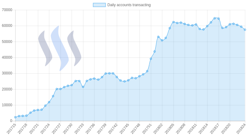 A 'transacting account' is a Steem account that made at least one transaction on the Steem blockchain. This can be a vote, post, comment, transfer, power up or sbd conversion. Users who only read from the Steem blockchain without interacting are not included. The actual number of 'Active users' is therefore much higher than the accounts transacting.