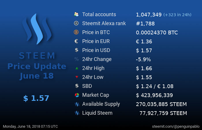 Welcome to my Steem Stats Report for Monday, June 18, 2018. All data comes directly from the Steem blockchain and is based on UTC time.