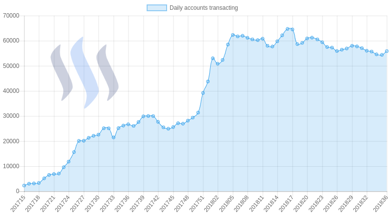 A 'transacting account' is a Steem account that made at least one transaction on the Steem blockchain. This can be a vote, post, comment, transfer, power up or sbd conversion. Users who only read from the Steem blockchain without interacting are not included. The actual number of 'Active users' is therefore much higher than the accounts transacting.