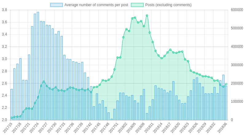 On the other hand, the number of post made every week increases as people try to get more returns probably due to low steem price. Even the number of upvotes has increased over the past three weeks.
