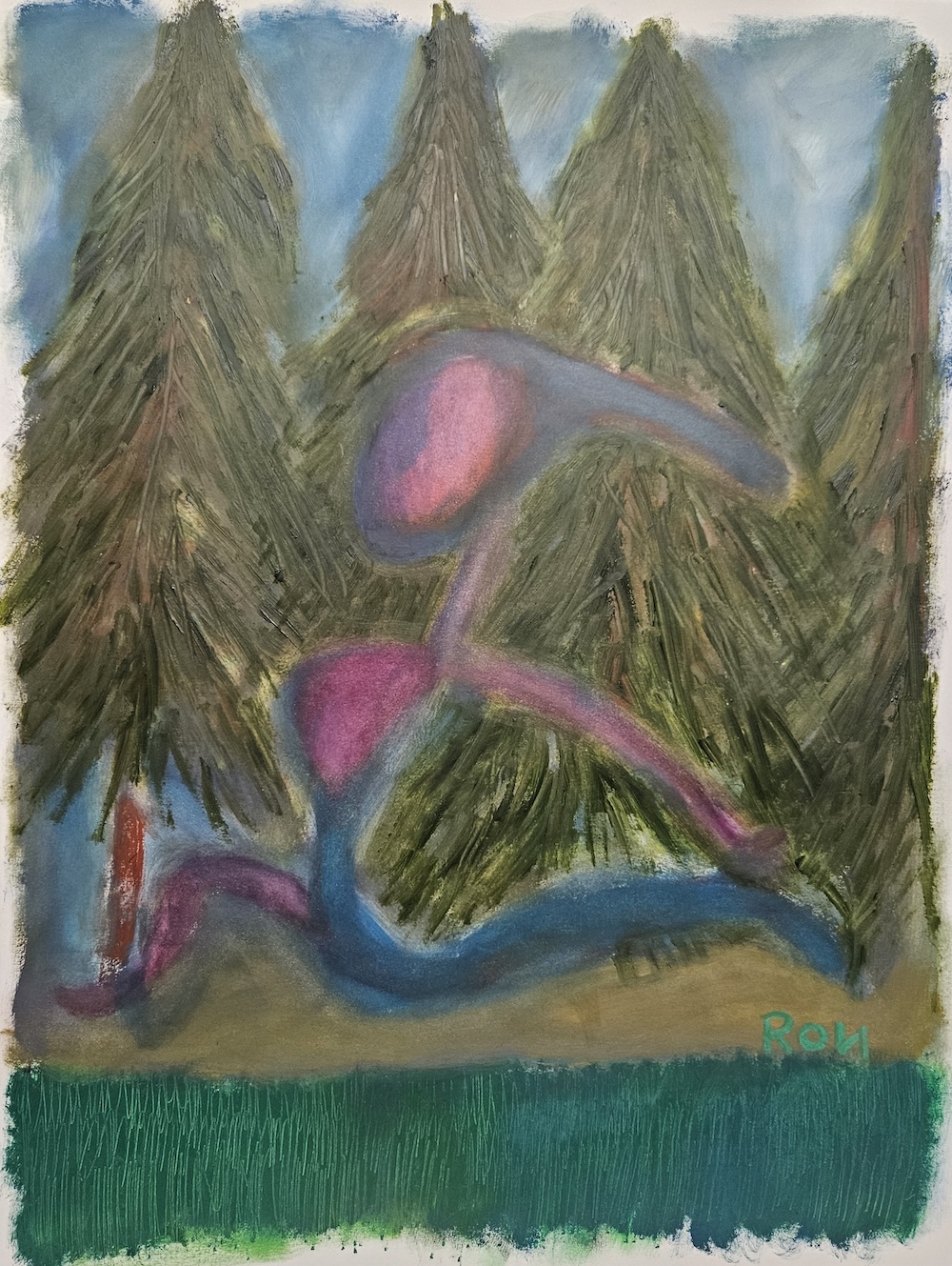 My Freethinking Girlfriend Running Through the Pines 2026. Oil on paper, 18 x 24"