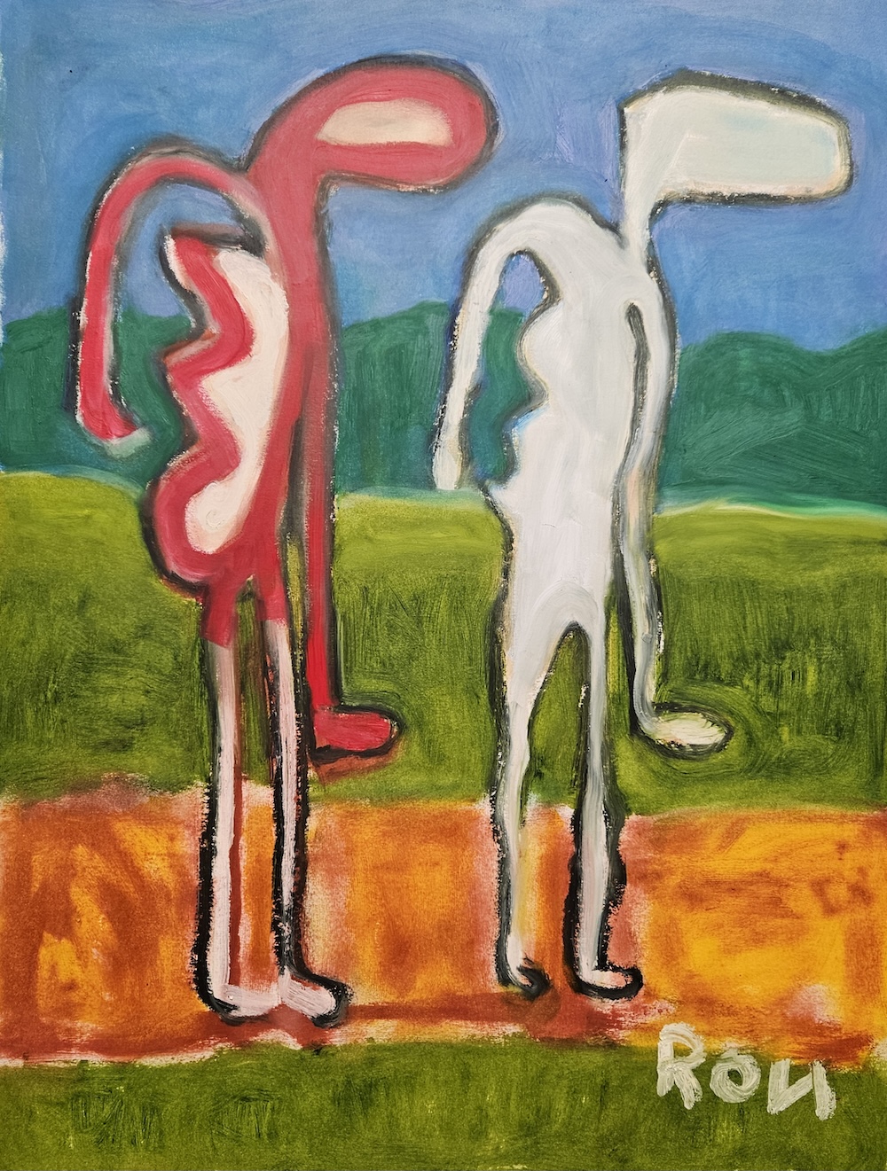 Cousins From the Same Village Before Breakfast 2026. Oil on paper, 18 x 24"