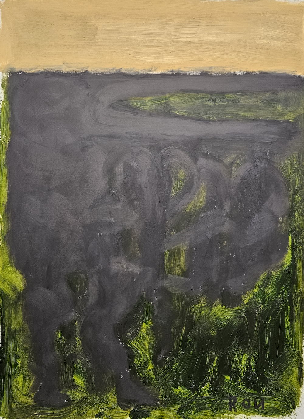 Strontium-90 Sunset in Naples Yellow, Sap Green, Neutral Gray, and Serial Comma 2026. Oil on paper, 18 x 24"