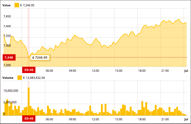 The top cryptocurrency is currently trading at $7,426 at press time, up just under 1 percent on the day. Bitcoin saw an intraday low of $7,246.