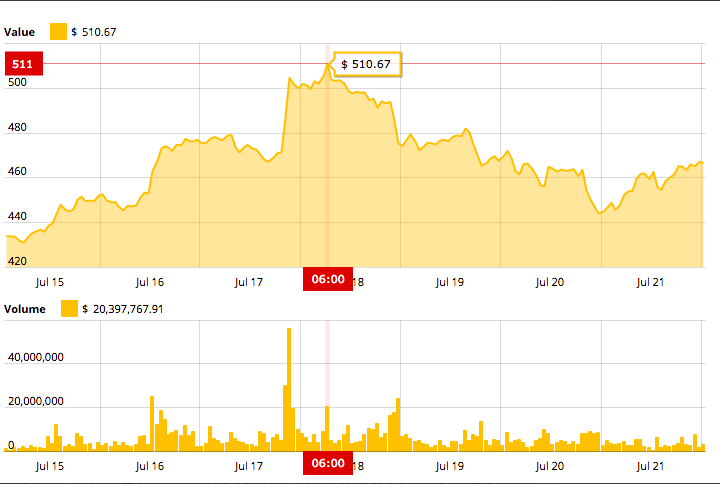 Top altcoin Ethereum (ETH) has seen more significant growth over the past 24 hours, up almost 5 percent and trading at $466 at press time. The altcoin is holding weekly gains of almost 8 percent, peaking at over $500 on July 18.