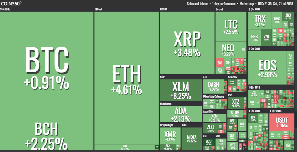 Crypto markets are seeing mostly green today, July 21, continuing the momentum of this week’s upswing. The top ten altcoins are solidly regaining strength today, up as much 8 percent, according to Coin360, with Bitcoin (BTC) only slightly in the green, hovering near yesterday’s levels.
