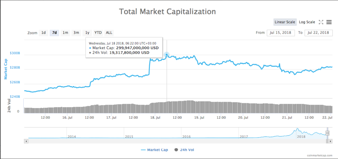 Total market capitalization of all cryptocurrencies is hovering around $282-283 bln, currently at $282.7, up about 2 percent over the past 24 hours to press time. Total market cap is down from this week’s peak of almost $300 bln.