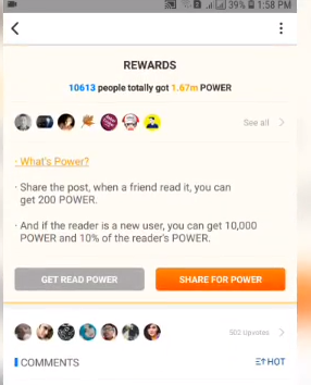 now every time you read a post you earn 100 power points for a maximum of two thousand power points or 20 articles per day to do that you to press read and then select an article after selecting an article you scroll down and then press get read power to get 100 points. I already reached my limit so I can across it anymore.