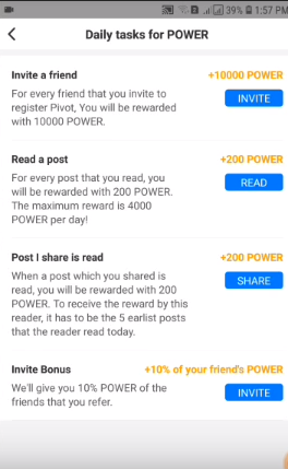 now how to do you earn currently, there are three ways are earned first you need to press for daily tasks for power as you can see there number one invites a friend if you invite a friend using your link you can automatically earn 10,000 power points and that invited friend every time he earns power points you earn 10% of that next is what you can read a post.