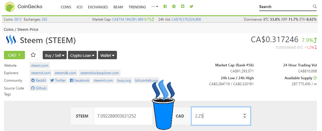 Today's SteemCoffee Price Dec 17 2018steemcoffee (29)in #steemit • 7 years ago $2.25 CAD for an XXL Coffee or 7.1 STEEM https://www.coingecko.com/en/price_charts/steem/cad #price #steem #coffee #steemcoffee