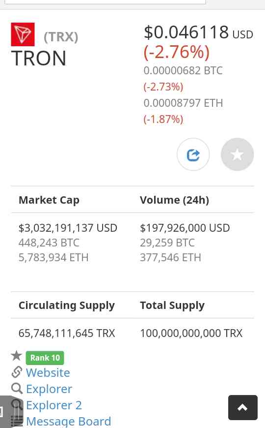 TRX(TRON)ေစ်းႏႈန္း-12.6.2018,Tuesusandi (41)in #steemit • 8 years ago TRX(TRON)ေစ်းႏႈန္း-12.6.2018,Tue ဒီေန႔အတြက္ TRX ေစ်းႏႈန္းကေတာ့ 1 TRX ကို 0.046118 usd ေစ်းေပါက္ပါတယ္။ 2.76 % ေစ်းက်သြားပါတယ္။ #cryptocurrency #life