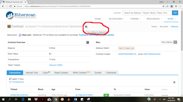 When the Etherscan webpage opens copy the full Ubrica contract address by clicking the copy button (make sure you use that button so that you don’t miss some letters or numbers of the address).