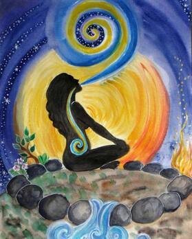 My breath held this entire time within an infinite silence, I hear a voice resume and speak closing words to the exercise; I slowly draw my hands toward my root. As I do so, my electric hands are feeling hot and connect with the buzzing energy from my squeezed perineum and a heat storm brews between the three in my lap.