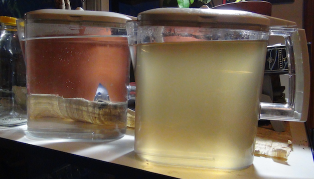 Distilled on the left, Dr. Willard's Dark Concentrate on the right. When you shake it in a bottle before drinking it, the sloshing makes a lot of microbubbles. I drink it like that because I think the motion activates his particular water.