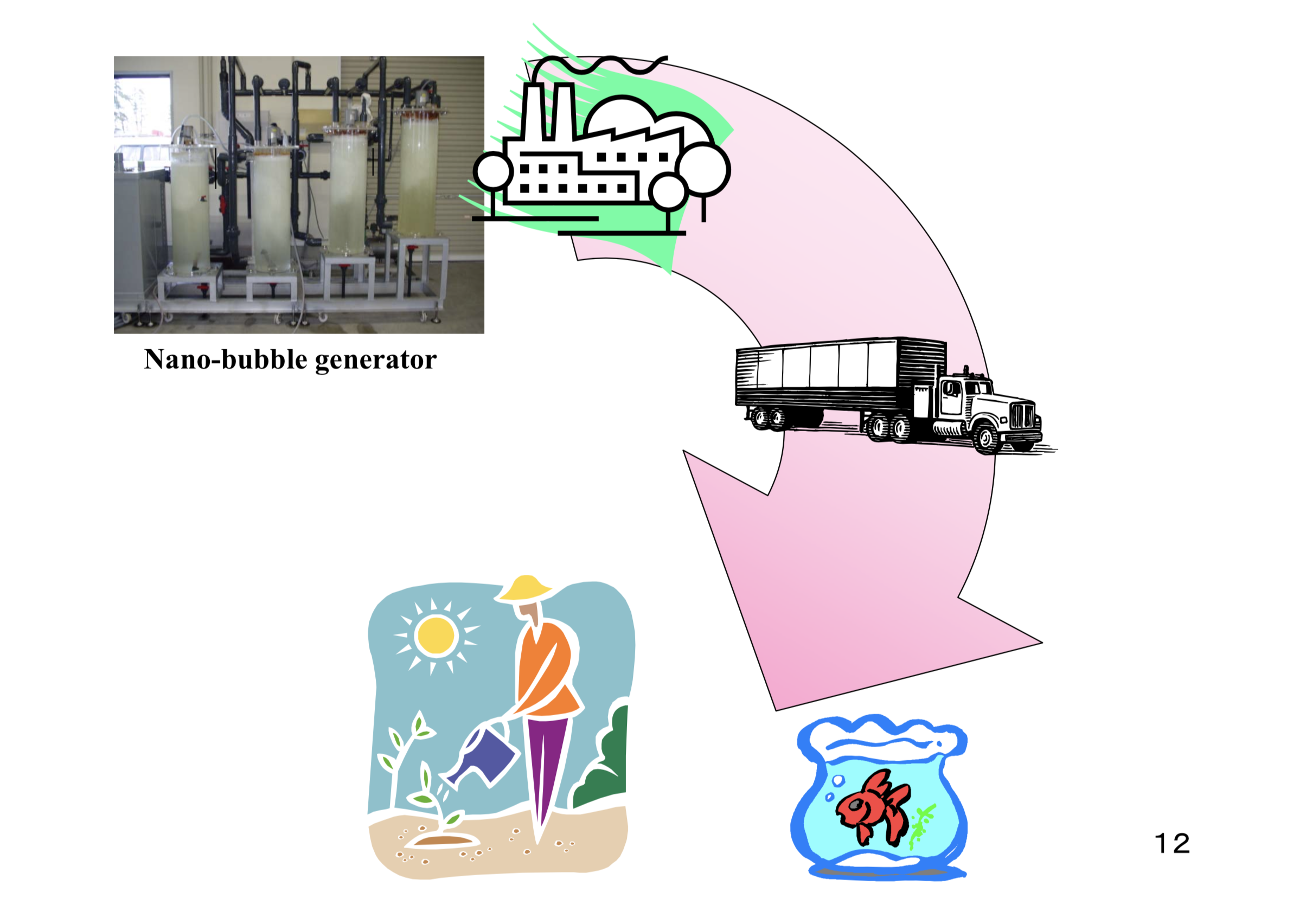 I think the system could be used to rapidly seed nanobubbles into lakes and ponds, aquariums, swimming pools, water storage tanks, etc.