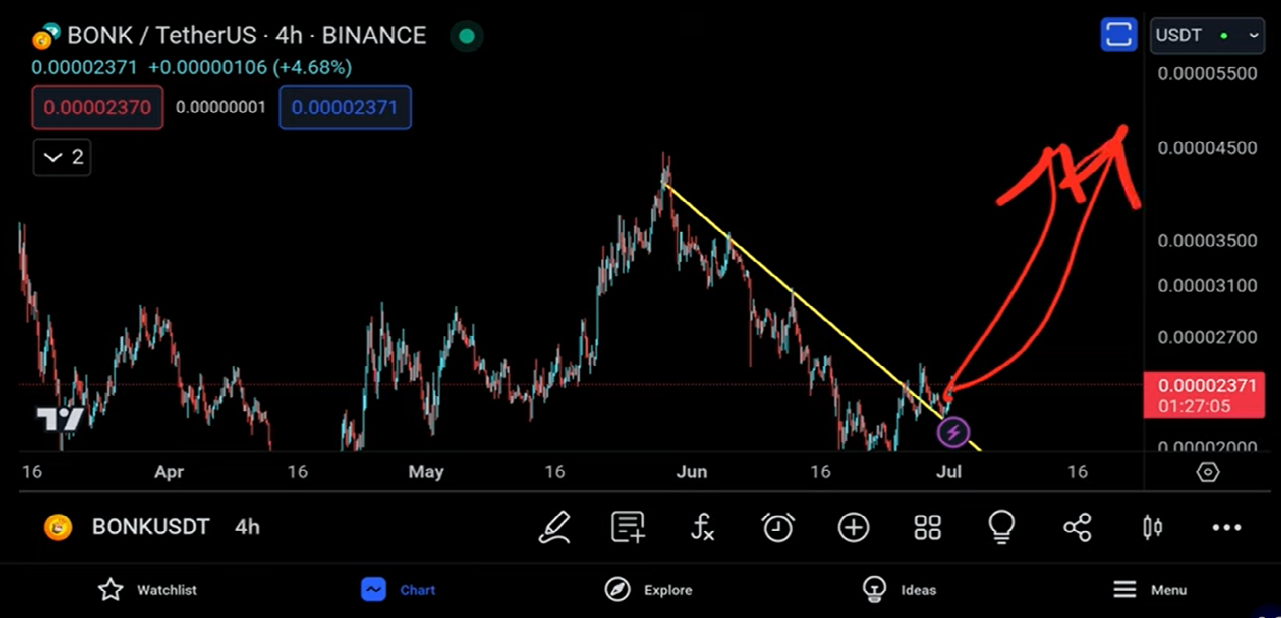 it does it not come down for the retest so Bitcoin is looking to come down for the retest and hopefully we get the retest and a confirmation just as we did on Bonk and from there Bitcoin goes back up again to 72k$ and Bonk goes back up again to 4500 so it's it's a pretty simple scenario at the moment so that's all for this quick update