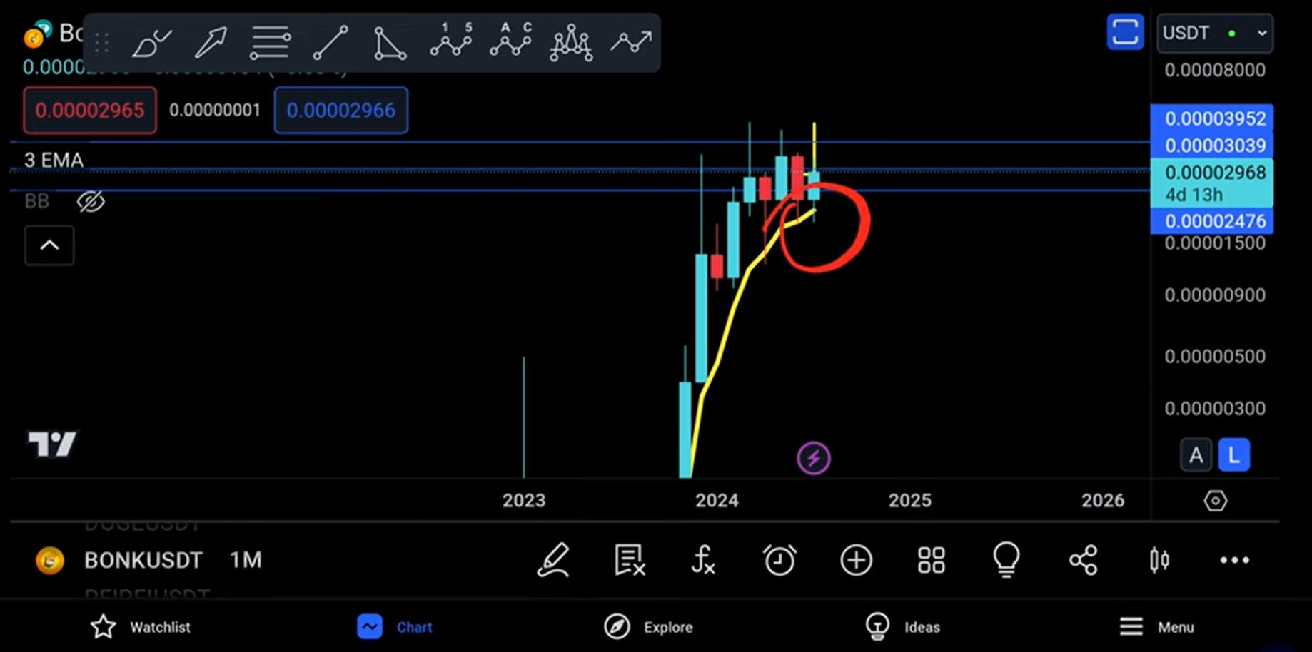 Bonk has disappointed me a little bit but that's okay now monthly here you still you can see that Bonk is being supported big time on big-time monthly by the 10 EMA and it has been quite extraordinary as well now