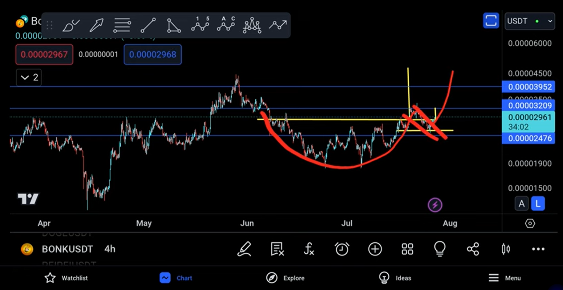 If we take the trend line then it looks like we're going to get Bonk to move up to this little bit of a Target which is 3217 up at the moment if I think that's just what I'm going to say and put today once you do that this is going to signify that you're even more interested in going back up to 3952 because do not forget you also have the rounded bottom here and this is a little bit of like maybe this time they what they try to do is maybe try to make the cup here and maybe the handle to go back to the upside