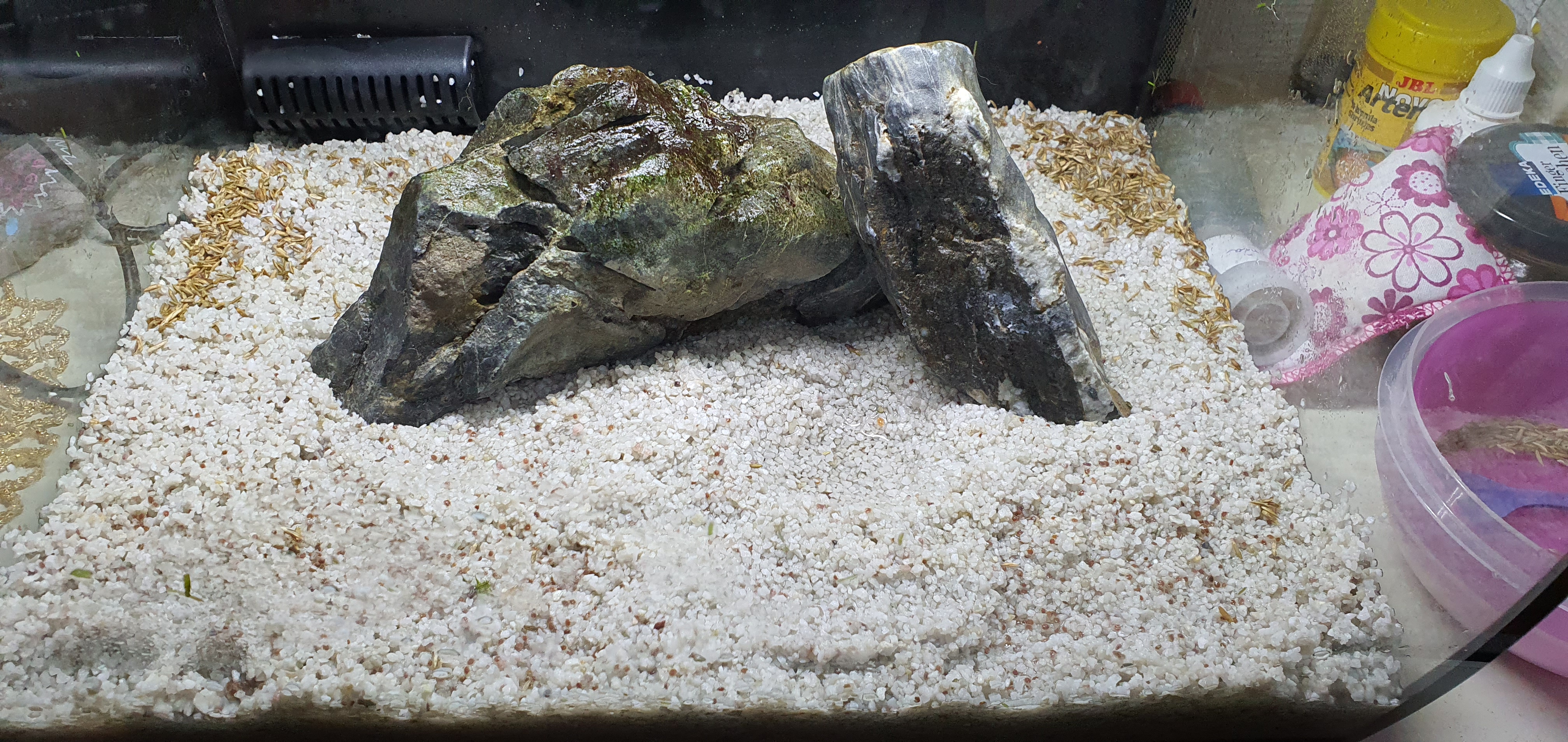 Hello dear community my new project is again about the aquarium. Until today I had my offspring in the small Fluval tank and it was time for something new. I am now testing the so-called Chinese seeds. How to do that? With the so-called Dry Start. What have I done? First of all everything out of the tank. Plants and substrate had to come out. I cleaned the substrate and the pool.Then I put the bottom gravel back into the basin. I used gravel and only put as much water into the pool as is needed to get it just under the edge of the gravel.