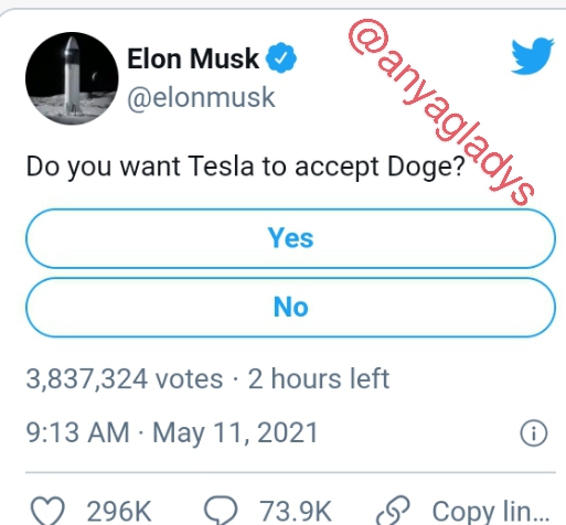 Another of his post on Twitter as you can see in the above screenshot. He asked is over 53million followers if Tesla should accept Dodgeoin and during this writing over 1 million followers bought Dodgecoin as it makes the up to shot up $0.46 to $0.54, before reducing back to around $0.50.