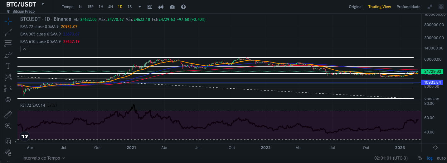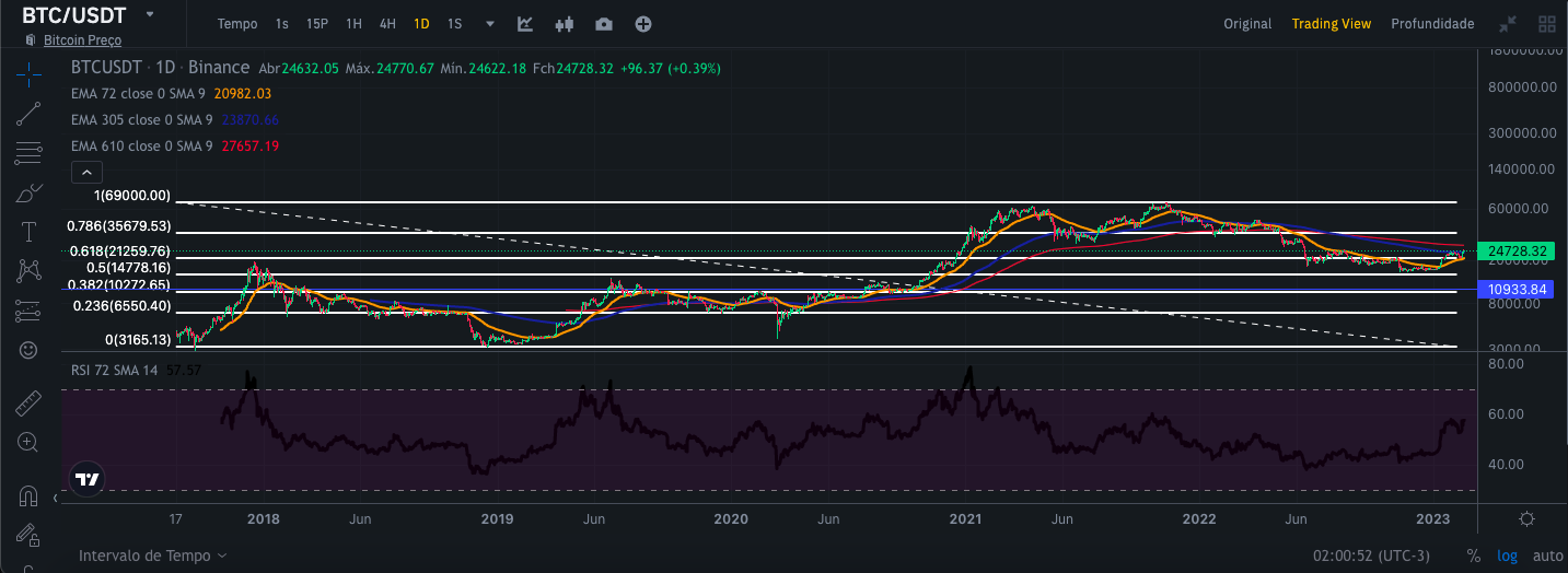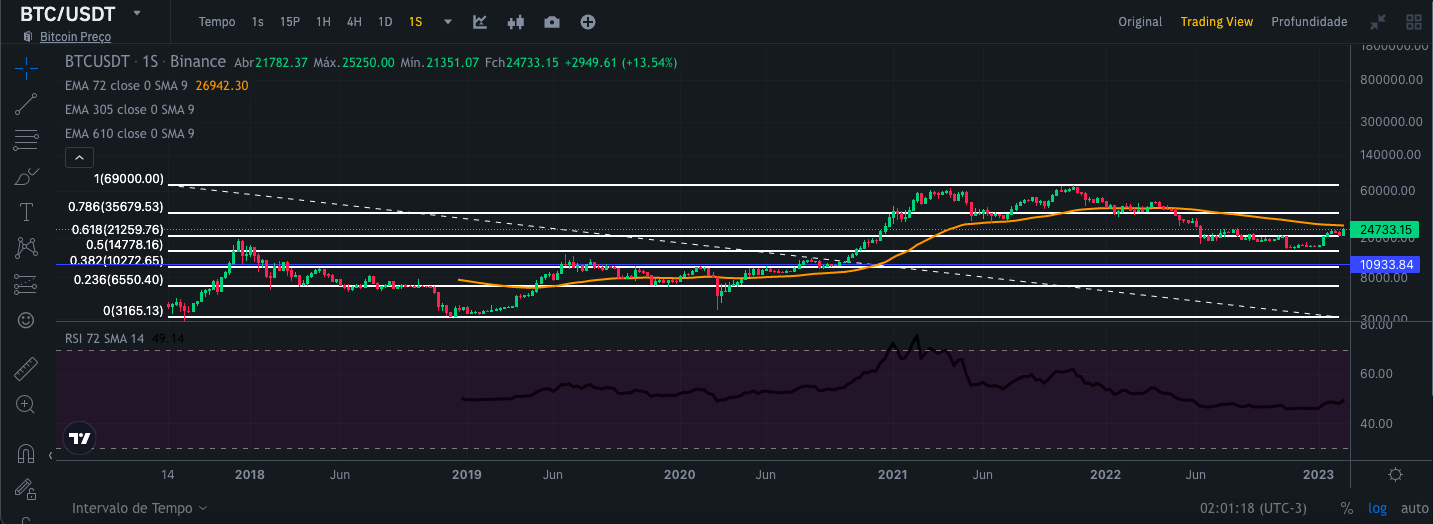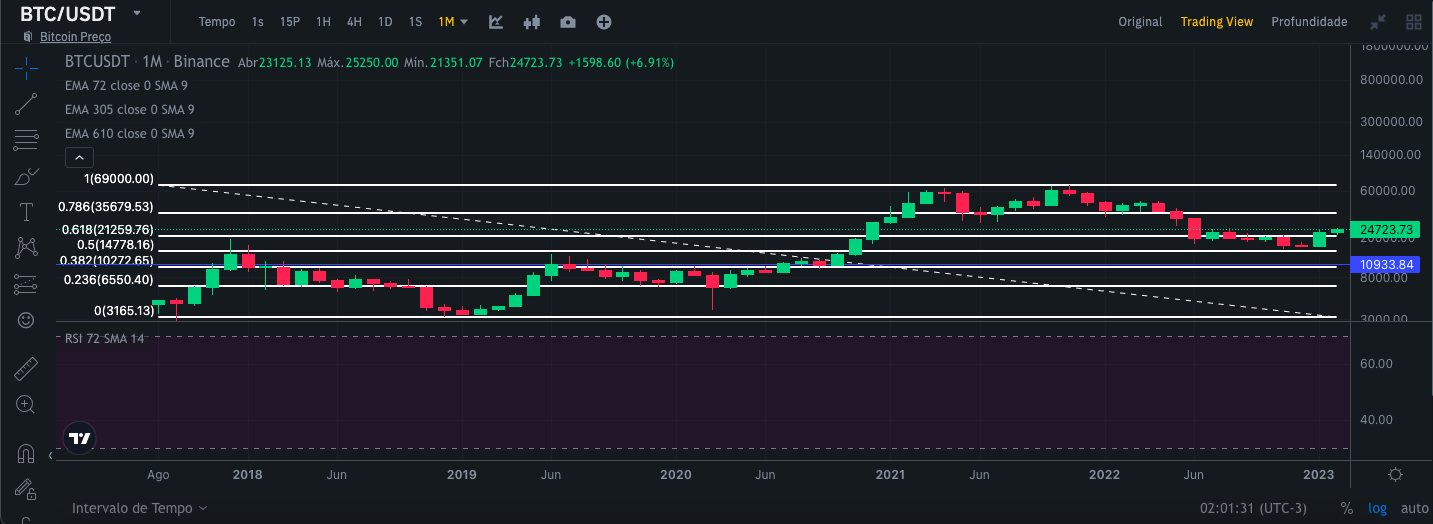 Para realizar essa análise, usei as visualizações do gráfico de velas da Binance por 1 dia, 1 semana e 1 mês, respectivamente, juntamente com as curvas médias exponenciais de 72,305 e 610 dias, canal de tendência de preços. e RSI desde 09/11/2017. Dessa forma, tenho um escopo mais amplo para poder fazer uma análise mais segura com uma série histórica maior. Vale lembrar que essa análise visa a médio e longo prazo.