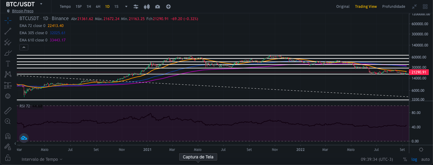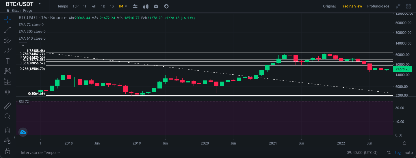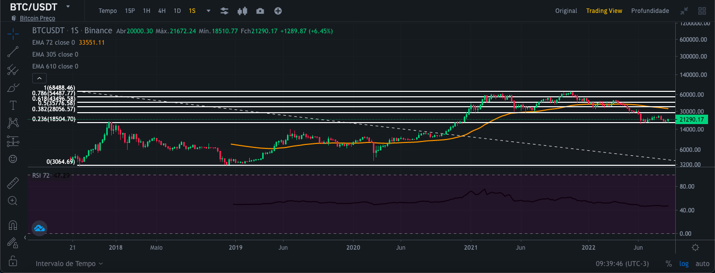 Para realizar essa análise, usei as visualizações do gráfico de velas da Binance por 1 dia, 1 semana e 1 mês, respectivamente, juntamente com as curvas médias exponenciais de 72,305 e 610 dias, canal de tendência de preços. e RSI desde 09/11/2017. Dessa forma, tenho um escopo mais amplo para poder fazer uma análise mais segura com uma série histórica maior. Vale lembrar que essa análise visa a médio e longo prazo.