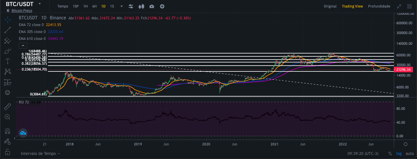 To perform this analysis, I used Binance's candlestick chart views for 1 day, 1 week and 1 month respectively, along with the exponential average curves of 72,305 and 610 days, price trend channel. and RSI since 11/09/2017. So I have a broader scope to be able to do a safer analysis with a larger historical series. Remember that this analysis aims at the medium and long term.
