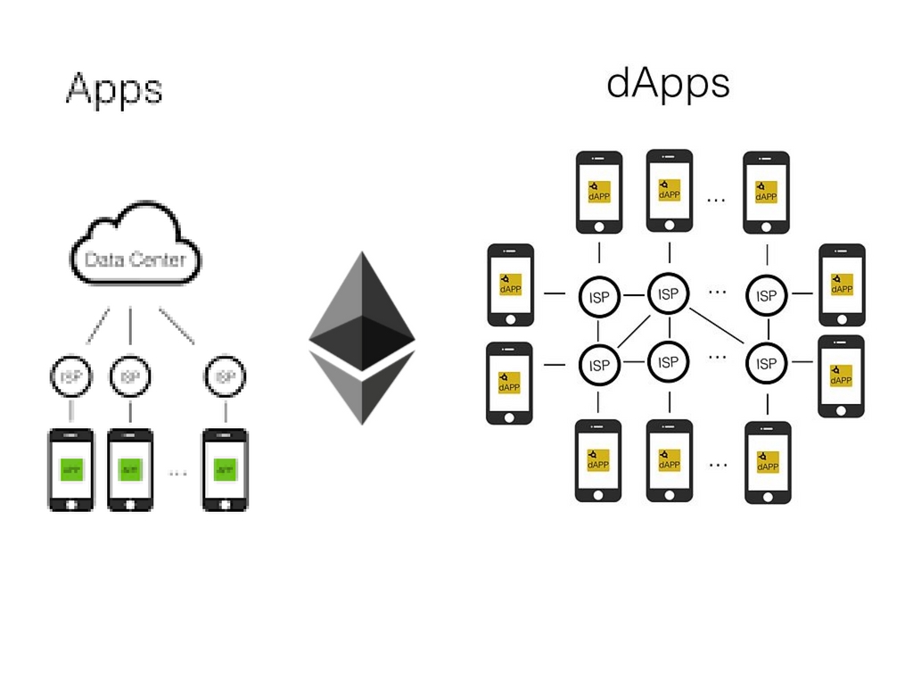 - dApps run on the decentralized blockchain using the P2P network eliminating any central authority, whereas other applications don't operate on a blockchain hence has a central architecture that controls all the data.