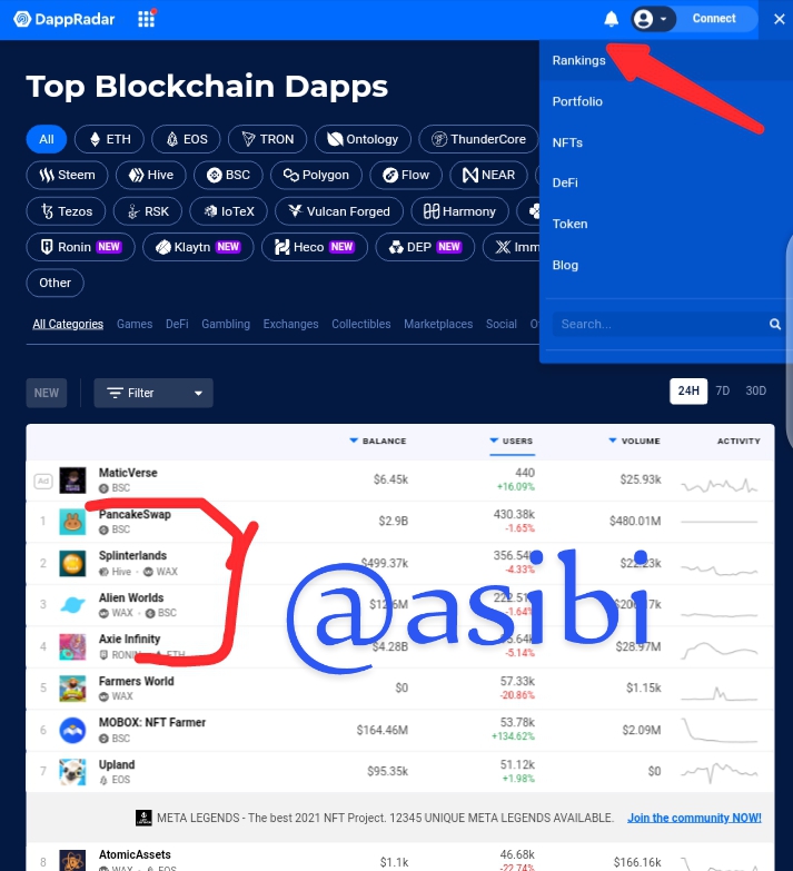 Step 2: after that, I will select on the Rank tab to view the most currently performing dApps. At the time of writing this post, the top four ranked dApps were ;
