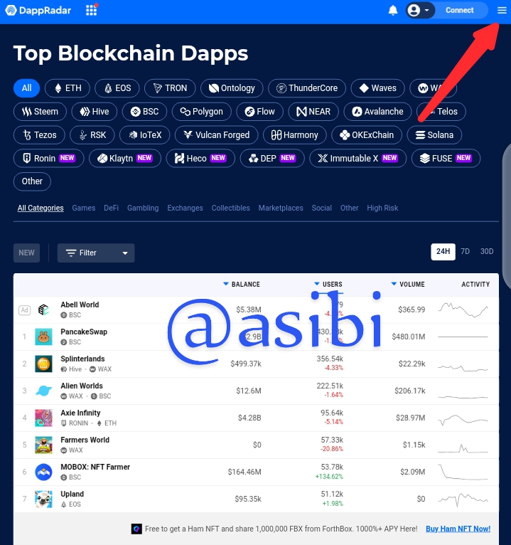 Step 1: You first of all search or visit the website https://dappradar.com, from the home page, select on the three horizontal strokes at the top right corner to the screen.