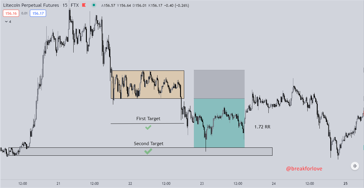 In LTC / USDT pair, we take a sell-side position. The asset, which entered the downtrend right after the uptrend, at some point becomes unable to fall any further and gets a reaction. However, it gets stuck between support and resistance and starts a chain of movements whose direction is uncertain but gives a clue (downtrend) to move in the direction of selling. Support-resistance zones tested at least twice give us confirmation of the formation. The strong candle that broke the last support zone is our entry point, and the top of the zones that work as resistance is our stop loss zone. We still take the height of the rectangle as TP, but if you are a trader who thinks that the price will visit the untested order blocks below, you can set that as the second TP. As a matter of fact, the price is getting reaction from that region.