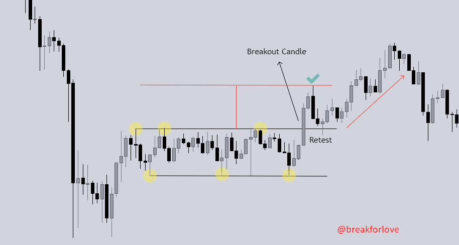 3. The asset, which has tested the support and resistance zones 2 or 3 times, should now break out of that zone with a breakout. It is also important for the trader to understand whether this breakdown is fake or not. If the breakout candle is with a strong candle, the path to the goal of the rectangular structure has begun.