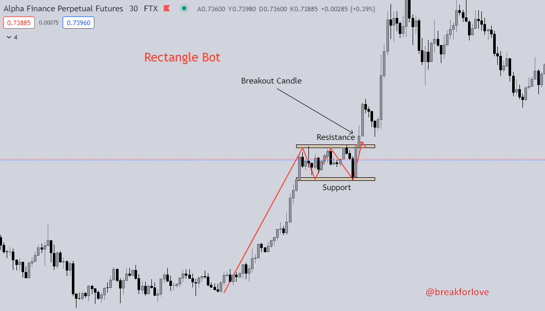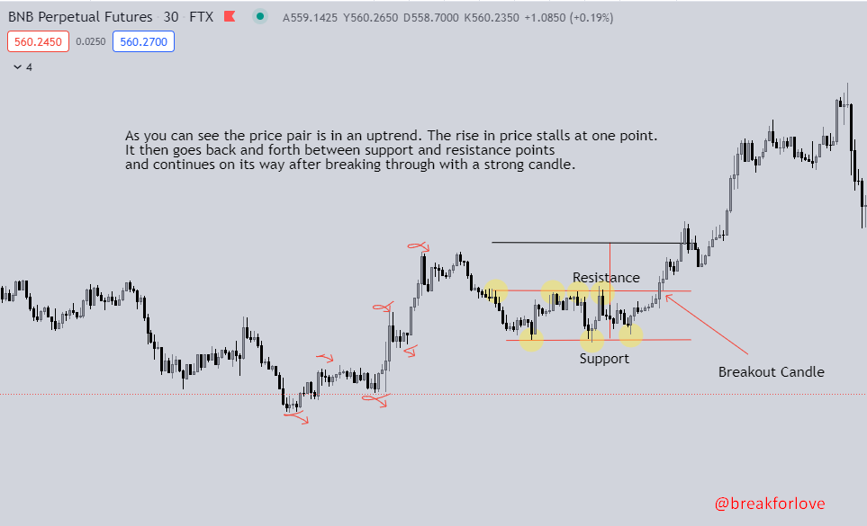 The chart above is a good example of forming a rectangle. In the example of the BNB / USDT pair, the asset is in an uptrend. It then enters a pause period and moves up and down between support/resistance zones. Knowing the direction of the trend, the trader positions himself in the direction of the resistance breakout. After the second contact, it waits for the breaking to come with a strong candle. As we can see in the chart, with the arrival of the breakdown, the price continues to progress until the target of the rectangular structure.