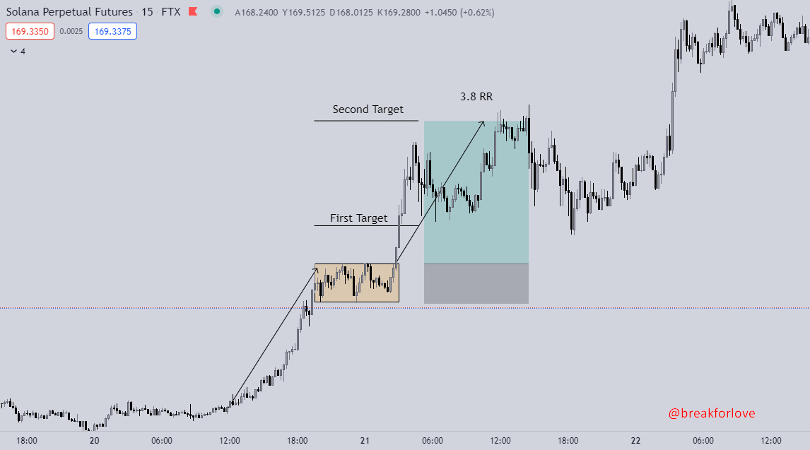When we look at the SOL/USDT pair, we can easily see that the price has formed a rectangle after the sharp rise. After receiving confirmation that the price has tested the support and resistance zone at least 2 times, we jump into the trend with the rise in the 3rd candle. The region we set as stop is below the support. If you want to be a successful trader, you have to follow the rules. According to this formation, the first target is as much as the structure formed by the rectangle. You should take your profit at the first TP point because there is no certainty that the asset will continue to rise. However, due to the possibility of continuing the upward movement, you may not close the position completely, and you can wait for another TP point.