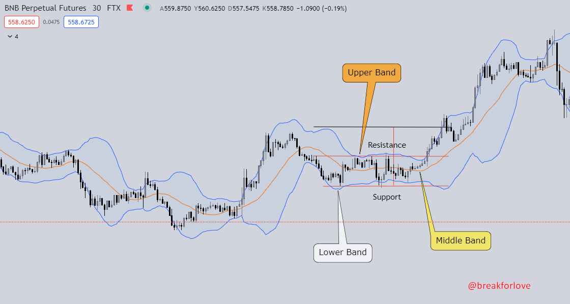 As we know, rectangular structures are formed as a result of the price movement up and down in a certain range. The support and resistance zones are tested several times and the price is stuck in a certain range. When I think about the structure of this formation, Bollinger Band may be the most useful indicator in my opinion. The Bollinger Band, which we learned in the previous lessons, is a type of indicator consisting of the upper, middle and lower bands, which allows us to predict the future price movement with the movements of the price between these bands. The trick here is that if a squeeze is observed in the Bollinger Band, the price may break out hard to the downside or upside after a while. Assuming that rectangular formations also cause price compression in a certain area, we can easily use this indicator as a helpful tool.