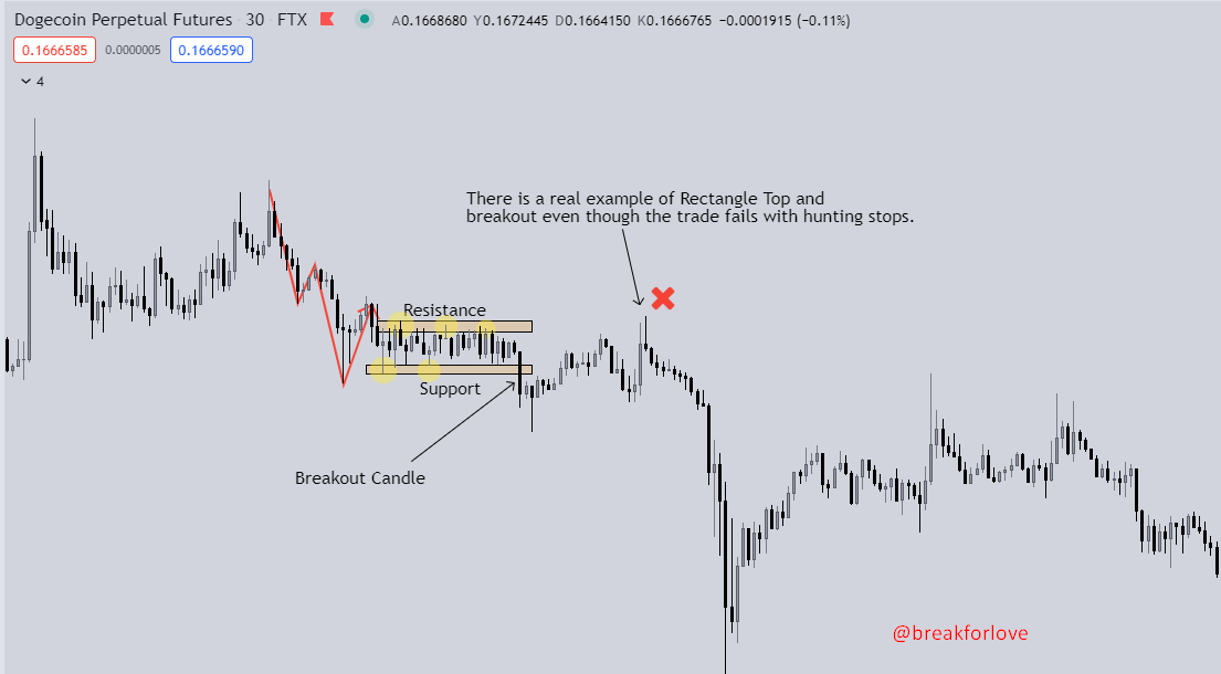 In the chart above, we can see the price action of the downtrend DOGE / USDT pair forming a Rectangle Top. The initial reaction from support after making a new Lower High (LH) continues as buyers push the price towards the resistance zone, but fails to break through the price zone that acts as the resistance zone. Then, the price action in this range breaks the support zone and continues its trend. It is also called Rectangle Top because the initial reaction is up from support.