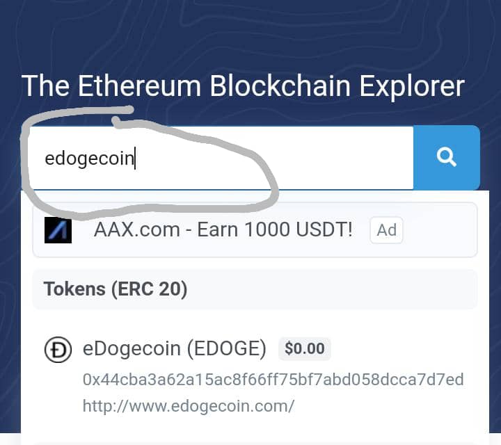 When the website opens you will see a search engine with an encryption search by “address/block/token” search for “edogecoin” in other to retrieve the contract token.