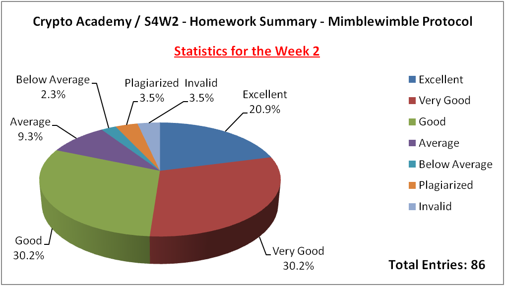 In this section, we would look at how things went in the homework task for week 2 as far as Mimblewimble protocol is concerned. A total of 86 homework was received and visited timely, below is the performance breakdown of the entries: