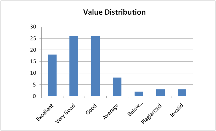 Excellent represents grades within 9 - 10, Very Good for grades within 8 - 8.9, Good for grades within 6 - 7.9, Average for grades within 5 - 5.9, Below Average for grades below 5, Plagiarized are the contents that are found to have been copied from another source without proper reference and Invalid are incomplete articles/Users Powering down/Insufficient SP for the Advanced level. Let's see the distribution on the charts below.